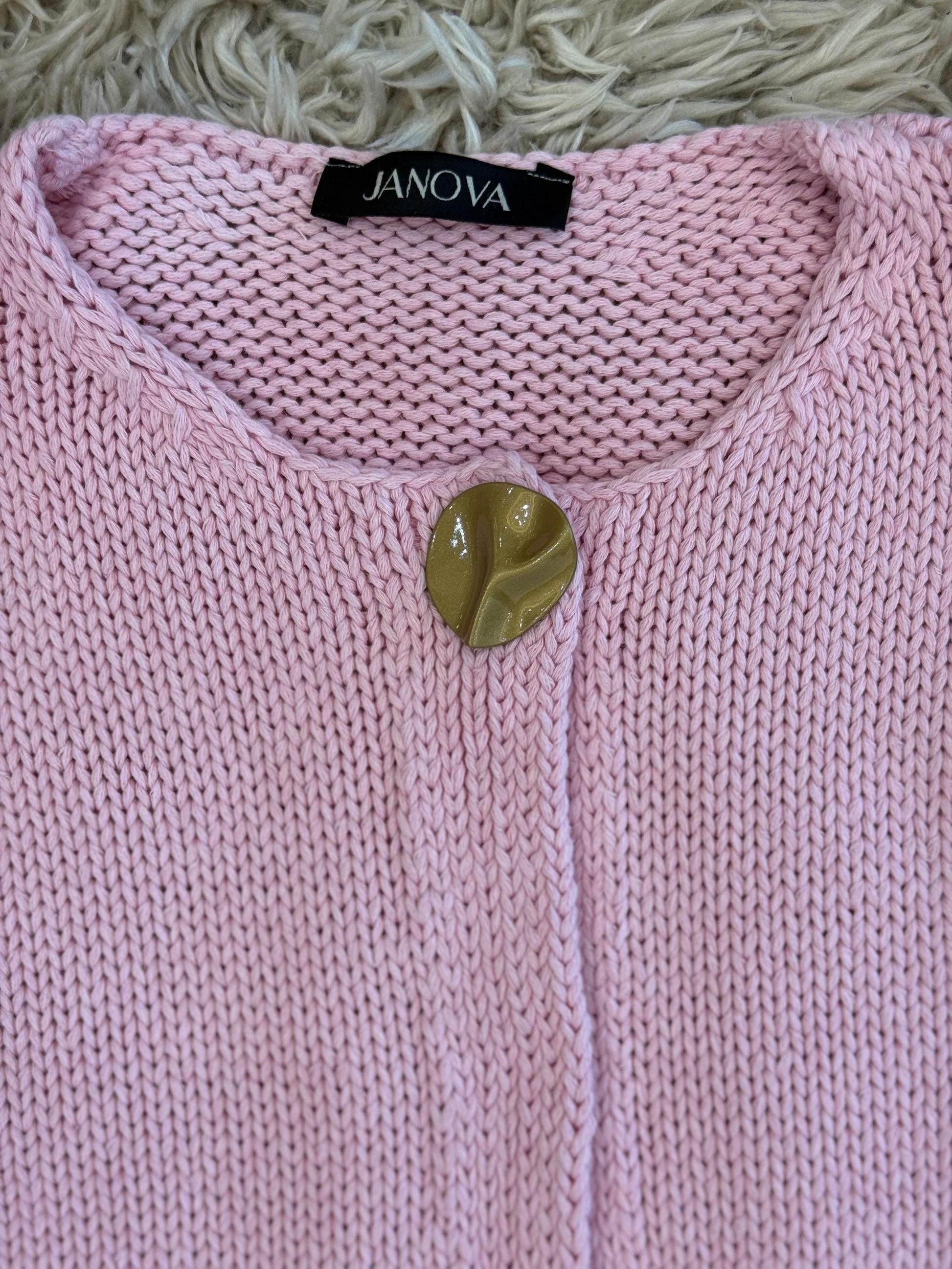 Soft knit sleeveless vest in a delicate pink shade, featuring statement buttons and front patch pockets. Easy to layer and perfect for everyday wear.