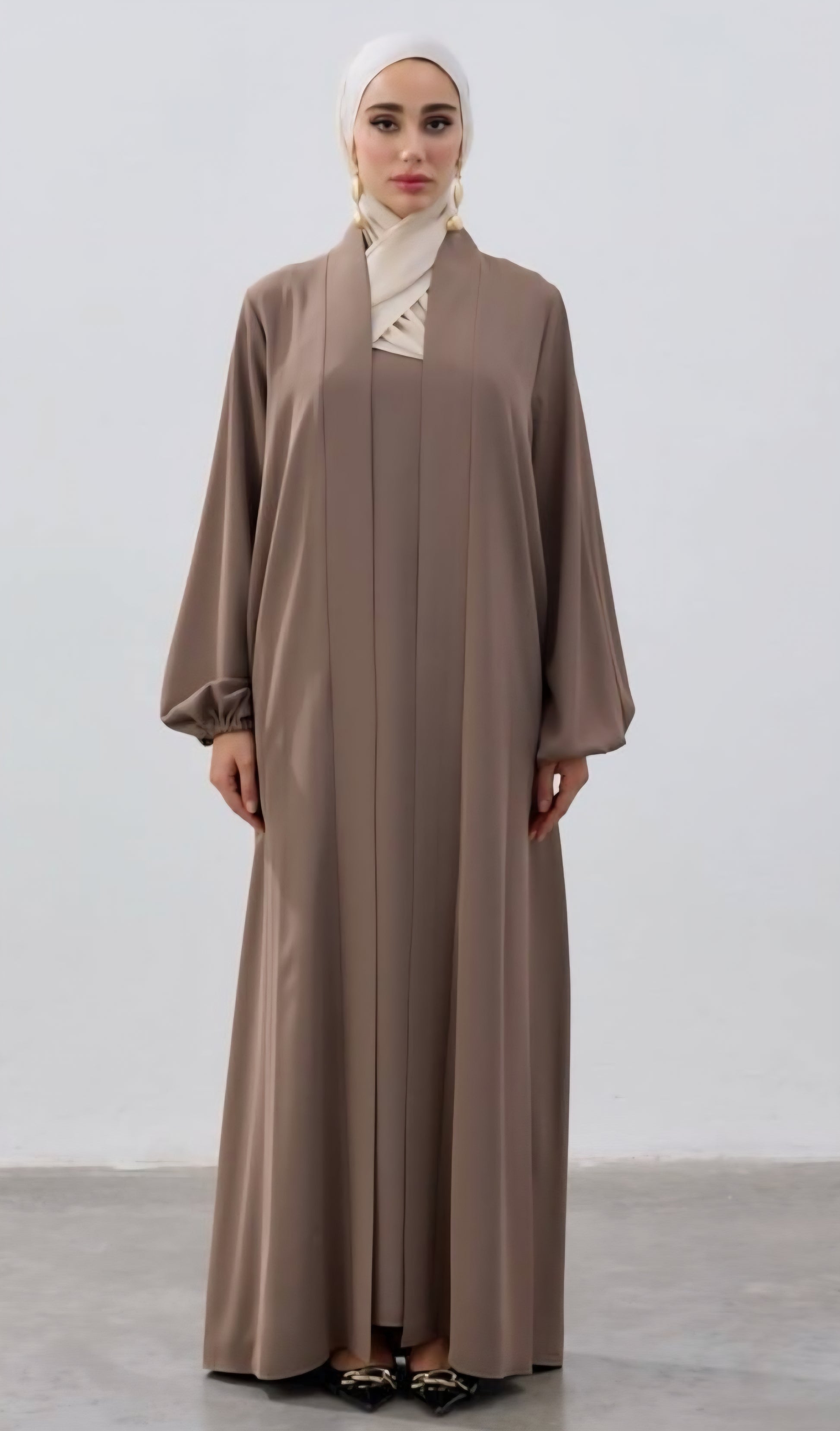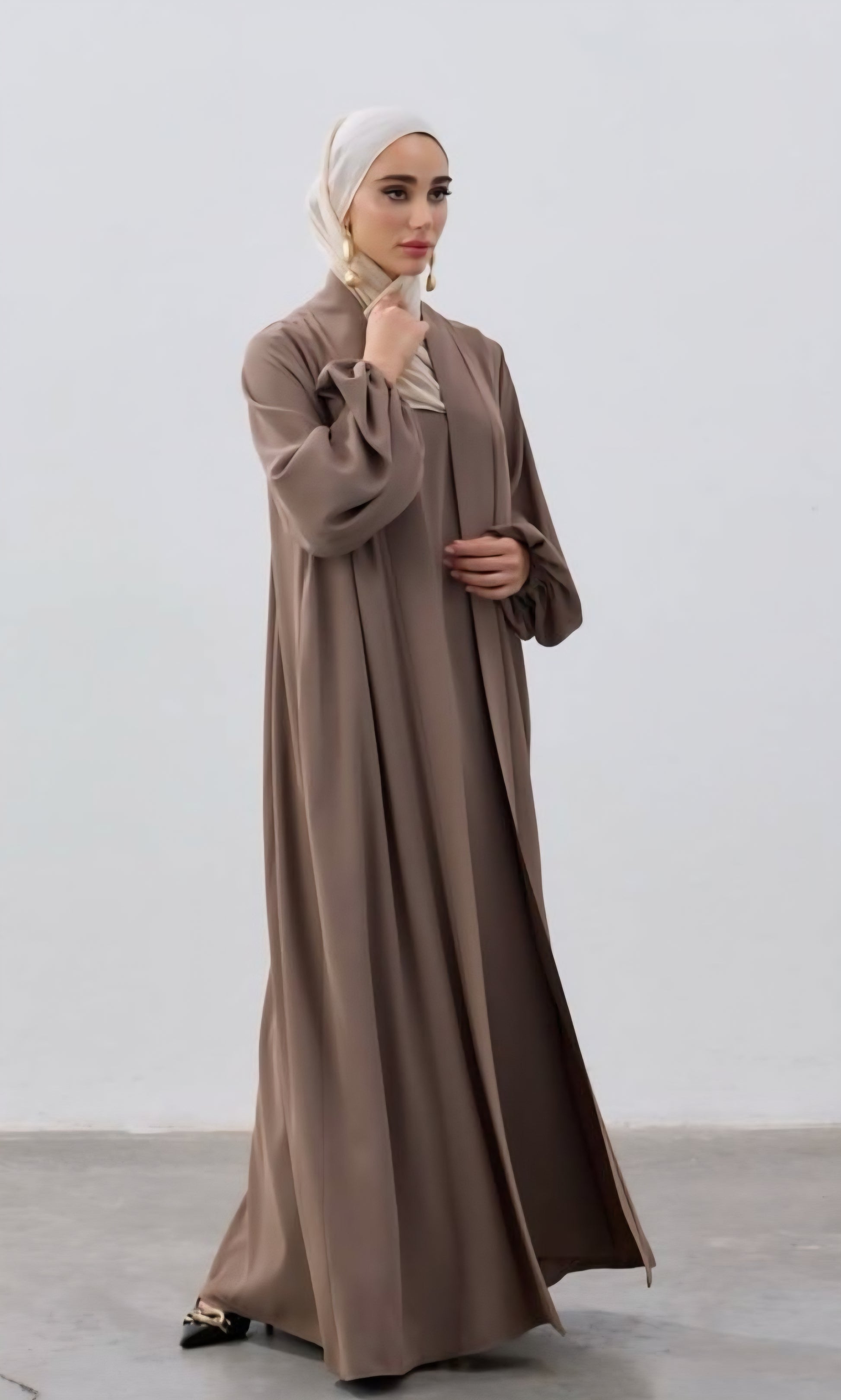 A timeless beige 2-piece abaya set featuring a flowy open abaya and matching inner dress. Designed for effortless elegance and all-day comfort — perfect for gatherings or refined everyday wear. ✨